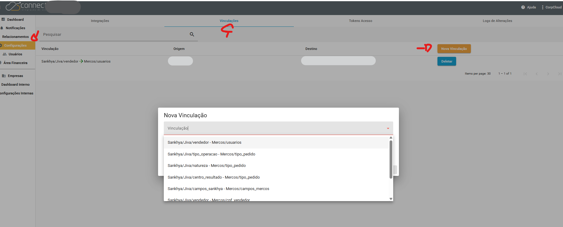 (Vinculações permitem associar um campo do Sankhya com a Mercos)